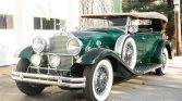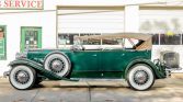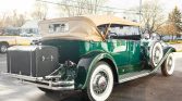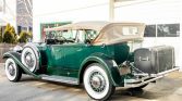 Packard 840 Deluxe Eight is a dual-cowl Sport Phaeton model and is powered by a 385ci L-head straight-eight paired with a four-speed manual transmission. It is finished in green with a tan soft top over dark green leather, and equipment includes a rear-mounted trunk, spotlights, chrome bumpers and trim, twin side-mounted spares, driving lights, and hood vents.