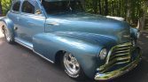 Noise deadening material throughout interior including roof panel and insulation. Mercedes Benz carpeting. Custom composite molded kick panels with Chevy emblem and bossed in trunk and back cockpit wall. Re-chrome 1946 grill and bumper all new hardware. All under body and frame inside door panels inside fenders have been painted with chassis saver paint.