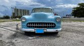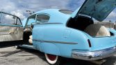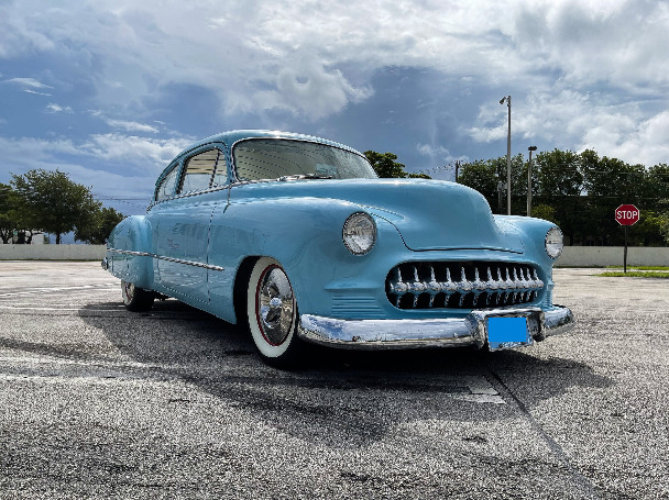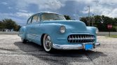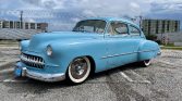 Beautifully custom executed car, 350ci engine, automatic transmission, electric powered assisted steering (super smooth), front suspension is a Fat Man dropped spindles upright, rear has stock springs, dearched 4 inches, plus 4 inch blocks and rear Monroe air shocks with on board air compressor, original 1950 frame, steel 15″ wheels with whitewall tires