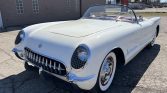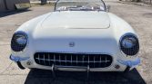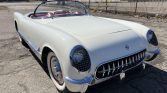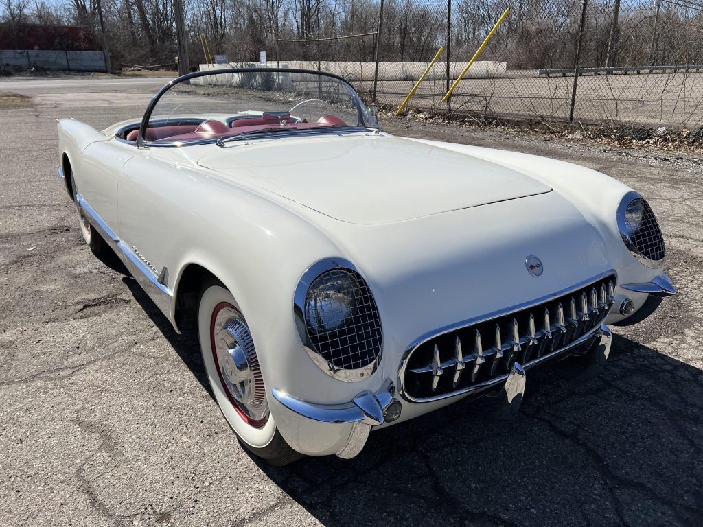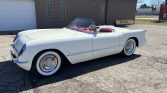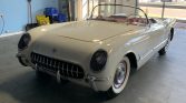 Polo White over red vinyl upholstery, and power is provided by a 235ci inline-six paired with a two-speed automatic transmission. Equipment includes a tan soft top, dual exhaust outlets, and triple side-draft carburetors.