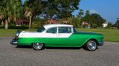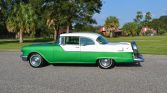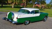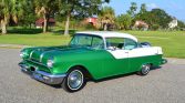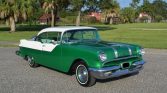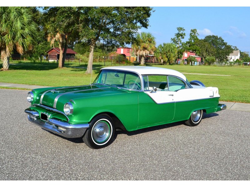 1955 Pontiac Chieftain Two Door Hardtop,287.2 CI V-8 Engine, 4 BBL Carburetor,4-Speed Hydra-Matic Automatic Transmission,Green & White Exterior over Custom Green & White Interior,15″ Painted Steel Wheels w/ Hubcaps,Radial White Wall Tires,Dual Driving Mirrors,Continental Kit,Cruise Skirts,Excellent Example,