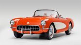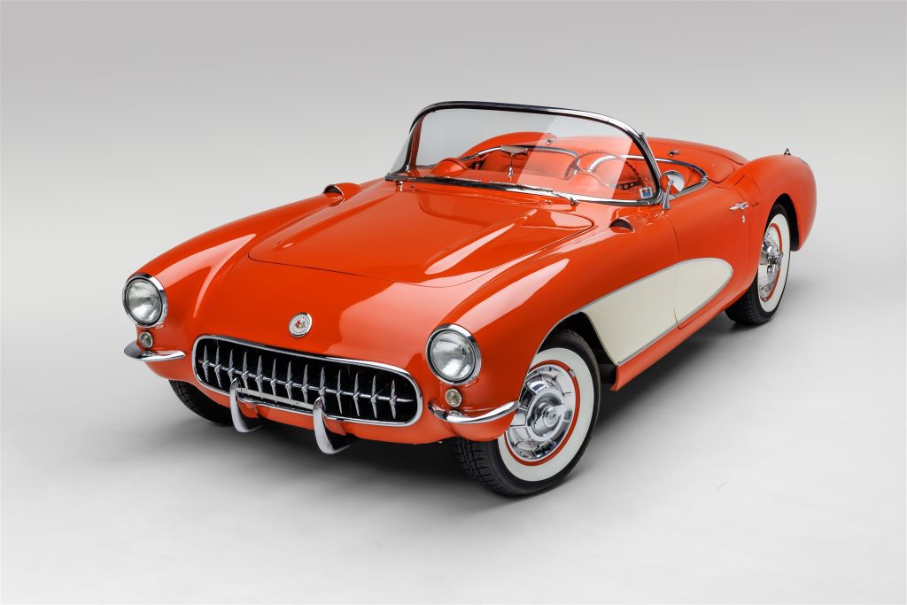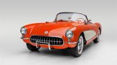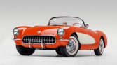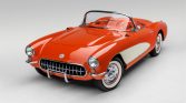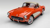 Finished in Venetian Red over red vinyl and is powered by a replacement 283ci V8 paired with a four-speed manual transmission. Equipment includes a tan soft top, 15? steel wheels with full wheel covers, dual-quad carburetors, Simpson belt harnesses, and a Wonder Bar radio.