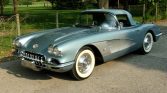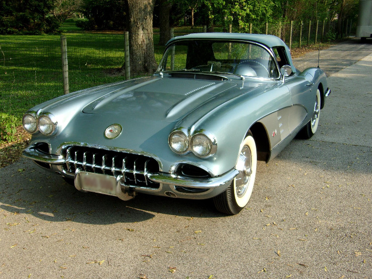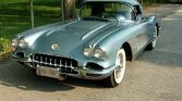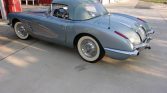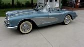 Is powered by a dual-carburetor 283ci V8 paired with a three-speed transmission. The car is finished in metallic blue with silver coves and features a blue vinyl interior, a blue soft top, chrome bumpers and trim, 15? steel wheels with covers, and a Delco/GM radio.