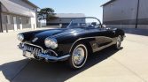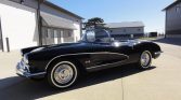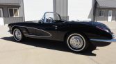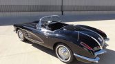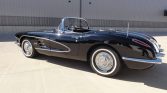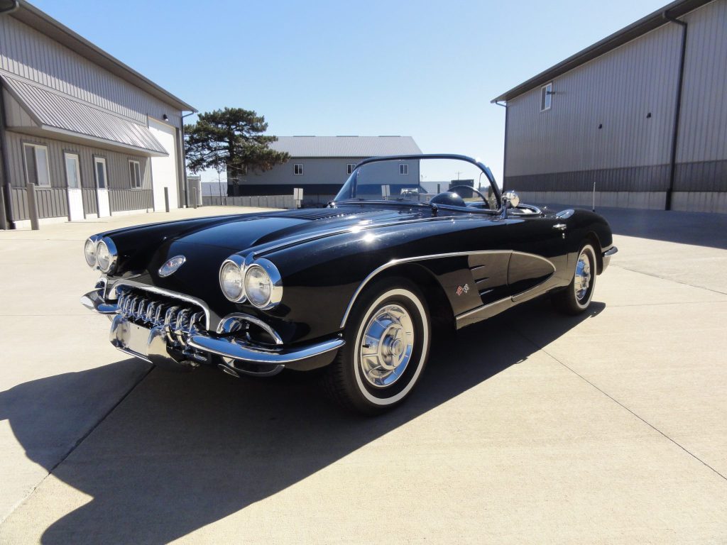 1958 Chevrolet Corvette finished in black with matching coves over a black interior and is powered by a replacement 283ci V8 paired with a Borg-Warner four-speed manual transmission. Features include a black convertible soft top, a body-colored removable hardtop, front disc brakes, 15? steel wheels with chrome covers, whitewall tires, chrome trim, a driver-side mirror, an AM/FM/cassette stereo, and a dual-outlet exhaust that exits through the rear bumperettes.