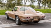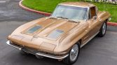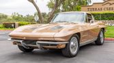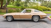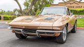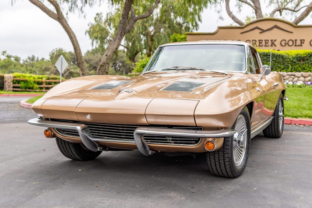 Power is supplied by a numbers-matching 327ci L76 V8 paired with a four-speed manual transmission, and the car is finished in metallic gold over brown vinyl upholstery. Features include a push-button Delco AM/FM radio, flip-up headlights, chrome split bumpers, and turbine-style wheels.