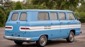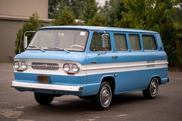 This 1963 Chevrolet Corvair Greenbrier Window Van is one of the reportedly only 11,993 Greenbriers produced in 63. It is equipped with its original 145ci. Pancake six-cylinder engine backed by a automatic Powerglide transmission. Correctly refinished in the original colors of Brigade Blue and Cameo white, it features seating for nine passengers with room for luggage. Additional features include manual windows and screens in the rear, seat belts in the front seat, stereo, five radial tires, and original wire wheel covers.