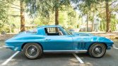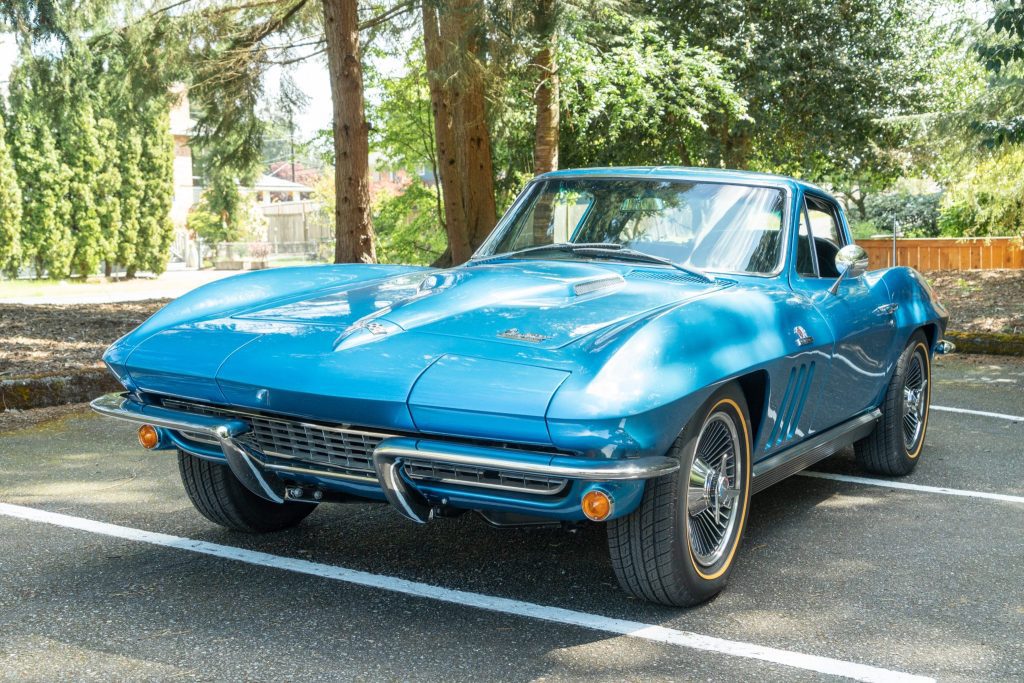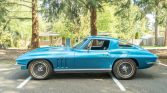 The car has been repainted blue over black leather upholstery and powered by a 427ci L72 V8 paired with a Muncie M21 four-speed manual transmission and Positraction differential. Additional features include a Delco AM/FM radio, electric windows, flip-up headlights, and 15 knock-off alloy wheels.