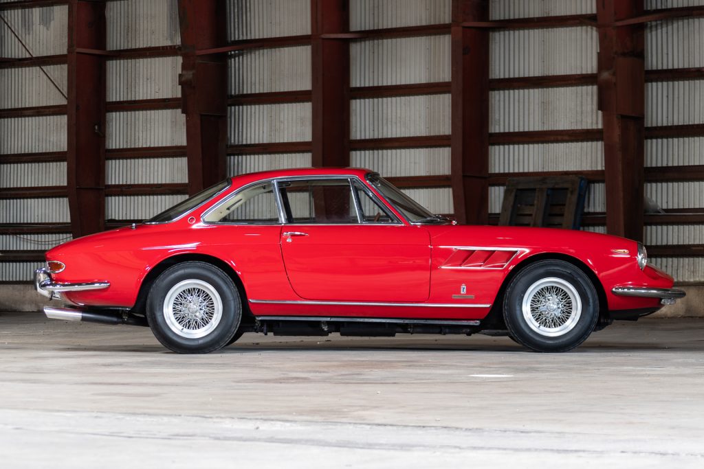 Its numbers-matching 4.0-liter Colombo V12 is paired with a five-speed manual transmission and is said to turn over by hand but has not been started. Additional equipment includes Borrani wire wheels, triple Weber carburetors, and power windows.