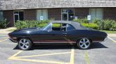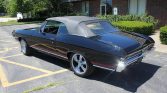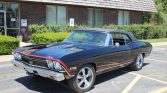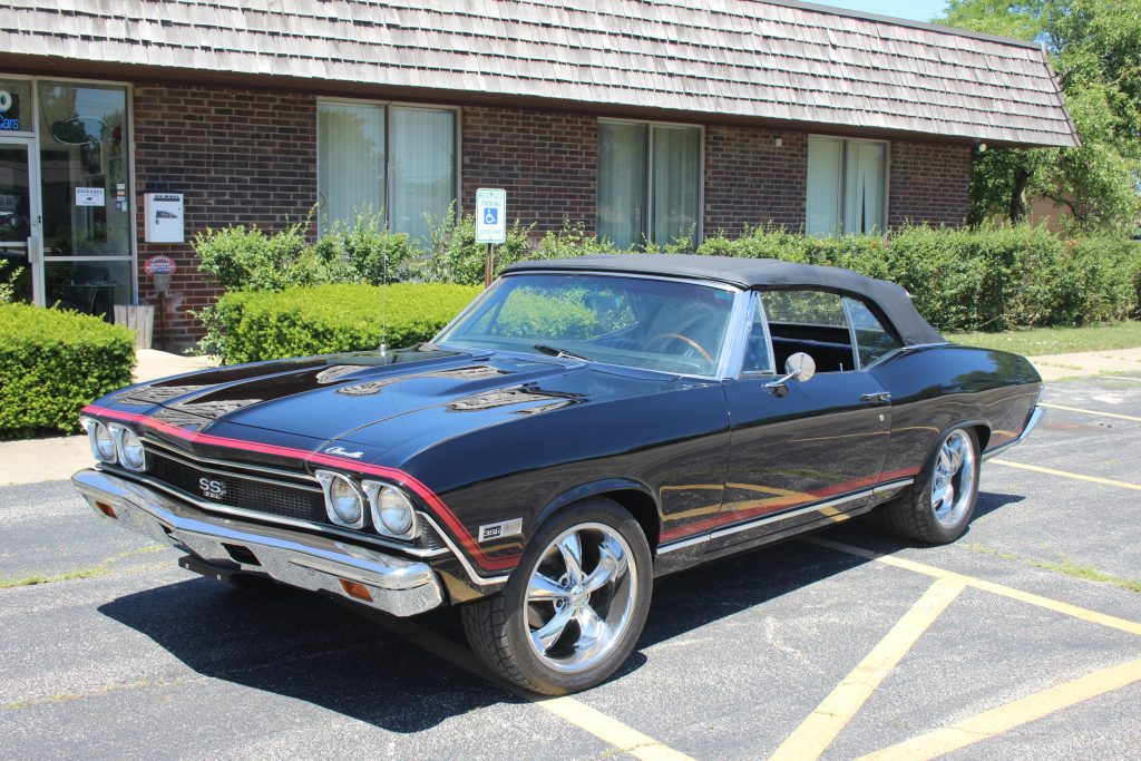 1968 Chevy Chevelle SS 396 Convertible in sleek black with black interior and top. Features a numbers-matching L78 engine and 4-speed manual transmission. Stock wheels and tires included.