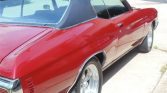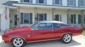 This car started life as a 1972 Malibu with a 350ci 2-barrel engine. It has since been restored and modified with a 1970 front clip and SS rear bumper. This was a nearly rust-free car with the exception of the drivers floor section which was professionally replaced. The car was repainted in Toreador Red Metallic which looks awesome and is offset nicely by the new vinyl top, brightwork, and 17″ aluminum wheels. Note too the SS badging and hood pins.This Chevelle now sports a 454ci engine that was built for the street.