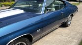 This 1970 Chevrolet Chevelle SS 396 underwent a frame-off restoration. It features a matching numbers rebuilt 396 cid big block V8 with 350 HP, cowl hood, and turbo 400 auto transmission. The Fathom Blue paint with white racing stripes shines beautifully. It boasts white bucket seat interior, power steering, power disc brakes, vintage air conditioning, and more. A stunning, show-ready classic car.