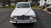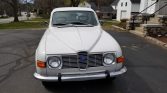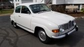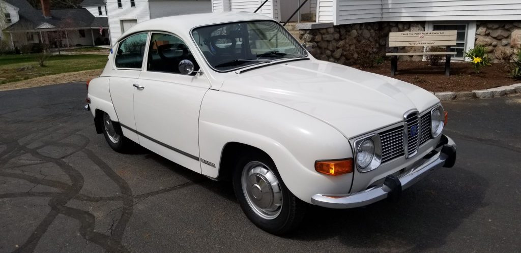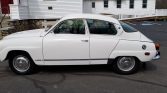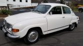 This 1973 Saab 96 features a 1.7-liter V4 engine with a four-speed manual transmission and a freewheel clutch. It has low mileage, a white exterior, and green upholstery.