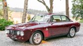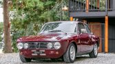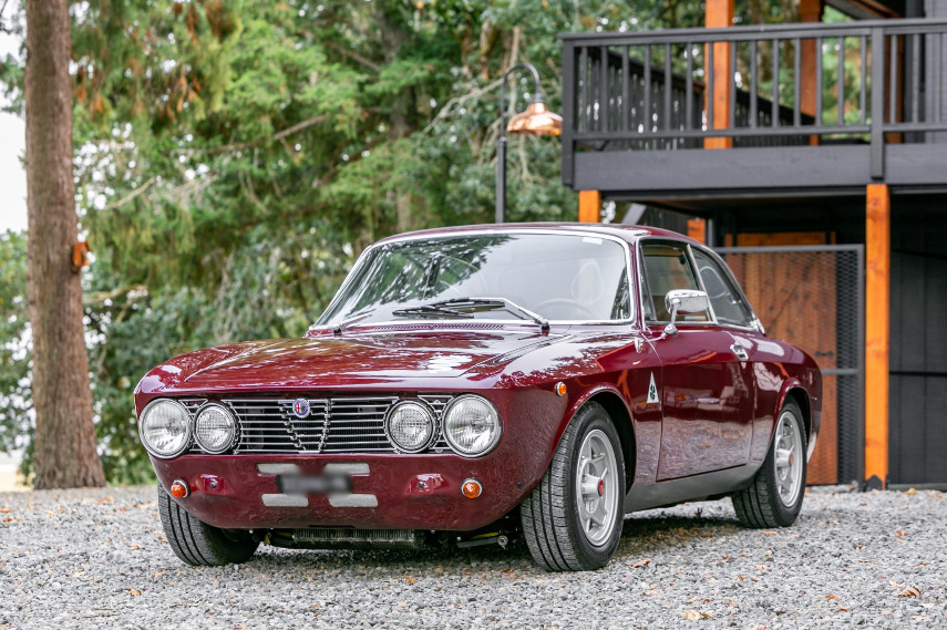 Alfa Romeo GTV 2000 in red boasts a 2.0L inline-four engine, five-speed manual, 14″ Cromodora wheels, lowered suspension, wood-rimmed Personal wheel, and Blaupunkt cassette stereo.