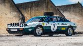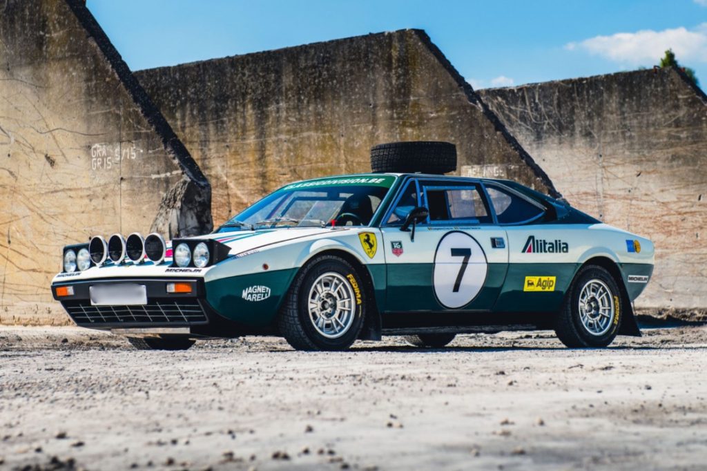 This Ferrari 308 GT4 is powered by a mid-mounted 3.0-liter V8 paired with a five-speed manual transaxle and has been refinished in green and white Alitalia-style livery. Rally-style modifications include a custom dash, racing seats, lightweight door panels, auxiliary lighting, plexiglass windows, alloy wheels, and replacement fiberglass bumpers.