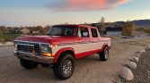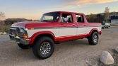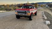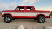 This Bronco-style truck is based on the chassis, drivetrain, and interior of a Ford F-150 SVT Raptor, is finished in red and white over black leather upholstery and is equipped with a supercharged 6.2-liter V8 paired with a six-speed automatic transmission and a dual-range transfer case. Additional modifications include a removable hardtop, a Roush cold-air intake system, and custom headliner and cargo area treatments. Additional features include heated front bucket seats, automatic climate control, cruise control, a CD sound system, and MyFord Touch infotainment with navigation and a backup camera.