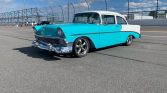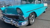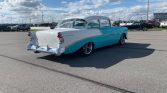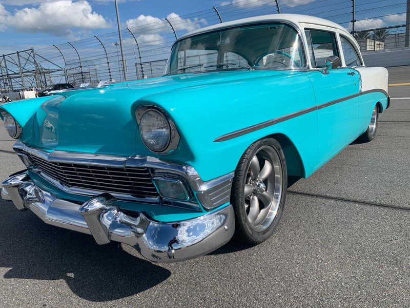 1956 Chevrolet Bel Air Restomod V-8 Engine Automatic Transmission Turquoise and White Exterior over Turquoise and White Interior Chrome Detailed Engine Compartment Vintage Air Conditioning Power Brakes Aftermarket Stereo System Aluminum Radiator Serpentine Belt System Tubuler Upper & Lower Control Arms Laser Straight Body Chrome Thrust Wheels