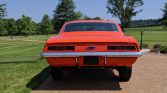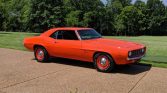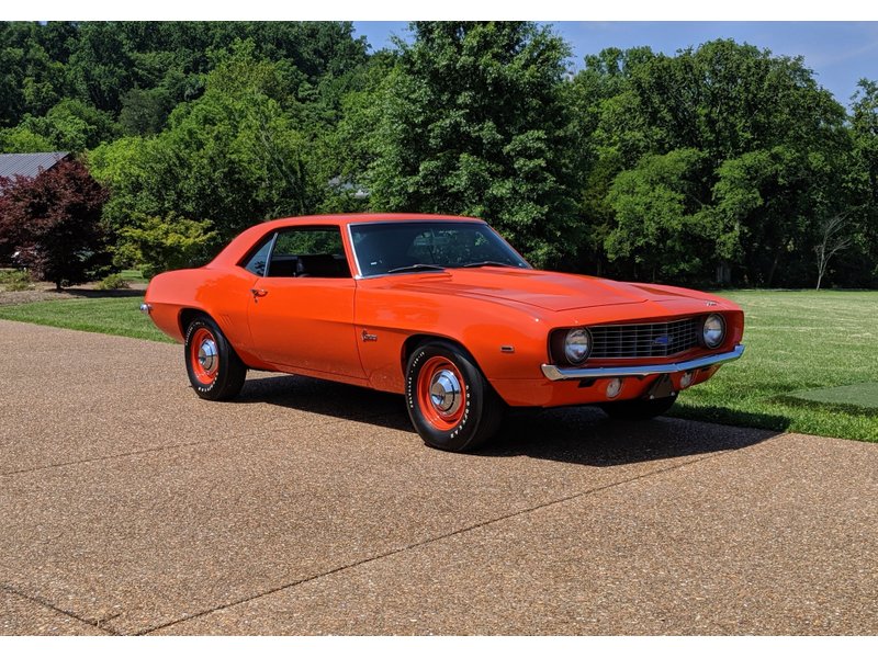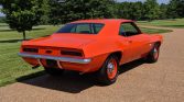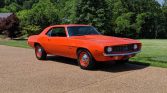 1969 Chevrolet Camaro COPO Tribute Date Correct 427 / 425 HP V-8 Engine Muncie 4-Speed Manual Transmission with Hurst Shifter Hugger Orange Exterior over Black Bucket Seat Interior COPO Tribute Rotisserie Restoration by Hendricks Chevrolet Power Front Brakes Cowl Induction Hood Laser Straight Exterior Steel Wheels With Goodyear Polyglas Tires Dual Exhaust System 12-Bolt Rear Axle with 3.73 Gears All New Chrome, Glass, and Weatherstripping From a Private Collection