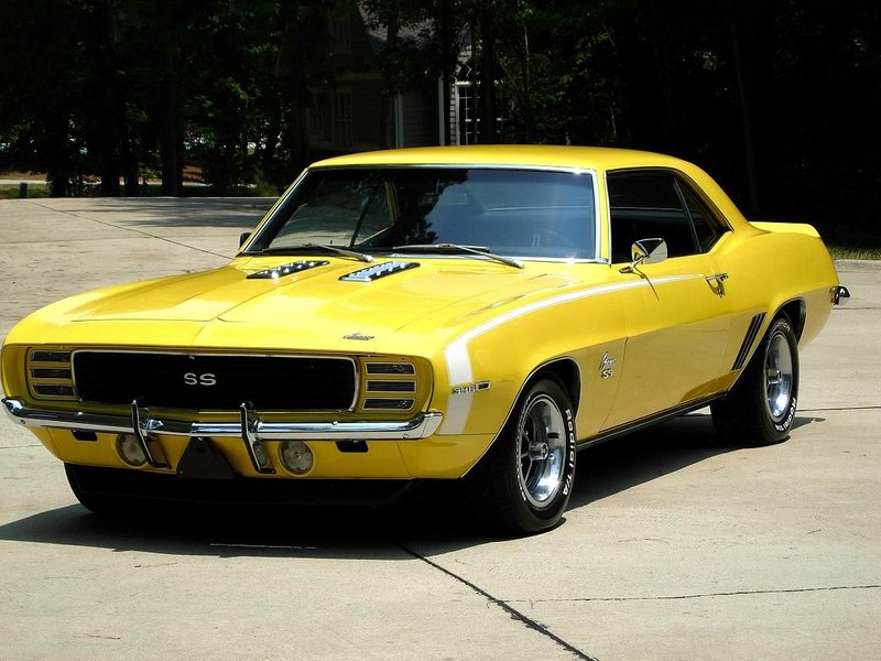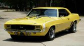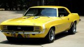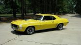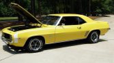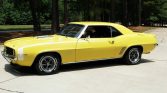 1969 Chevrolet Camaro RS / SS Coupe 396 V-8 Engine with 350 HP 4-Speed Manual Transmission with Hurst Shifter Daytona Yellow Exterior over Black Interior With White Hockey Stick Striping Deluxe Houndstooth Interior Power Steering Power Front Disc Brakes Rosewood Steering Wheel Console with Gauges and Tachometer AM / FM Radio with Rear Mount Antenna Driver and Passenger Exterior Mirrors Front and Rear Spoilers Front and Rear Bumper Guards 12-Bolt with 4.10 Posi-Traction Rear End