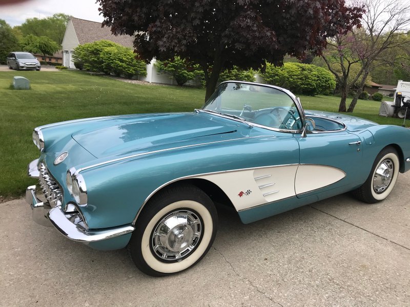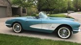 1959 Chevrolet Corvette Convertible 327 V-8 Engine with 350 HP 700R4 Automatic Transmission with 4:11 Gears to the Rear Rare Crown Sapphire with Snowcrest White Coves over Turquoise Interior Frame Off Restoration New Turquoise Soft Top New Interior and All Chrome Redone and Stainless Steel Trim Buffed Factory Power Windows Wide White Wall Tires Only 888 Manufactured in this Crown Sapphire Color