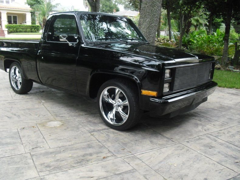 1986 Chevrolet Custom Pickup 383 V-8 Stroker Motor Rebuilt Automatic Transmission Black Exterior over Black Interior with Red Stitching Air Conditioning Power Steering 4-Wheel Power Brakes Power Windows Power Door Locks Carbon Fiber Face Gauges Tinted One Piece Side Windows Billet Grille 20-Inch Chrome Riddler Wheels