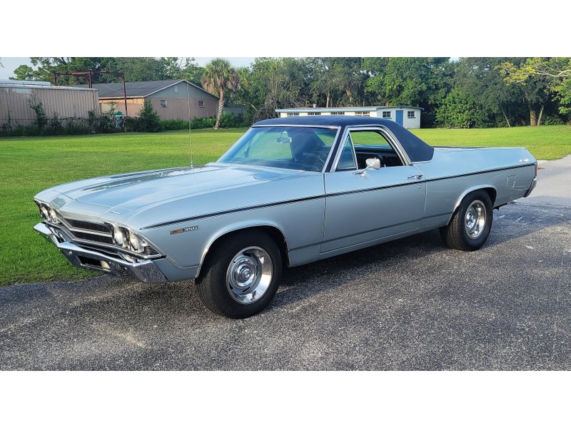 1969 Chevrolet El Camino Pickup 350 CI V-8 Engine 350 Turbo Automatic Transmission Silver Exterior over Black Interior New Black Vinyl Top New Paint New Chrome 8-Inch Rally Wheels