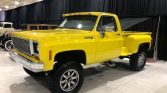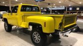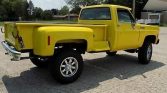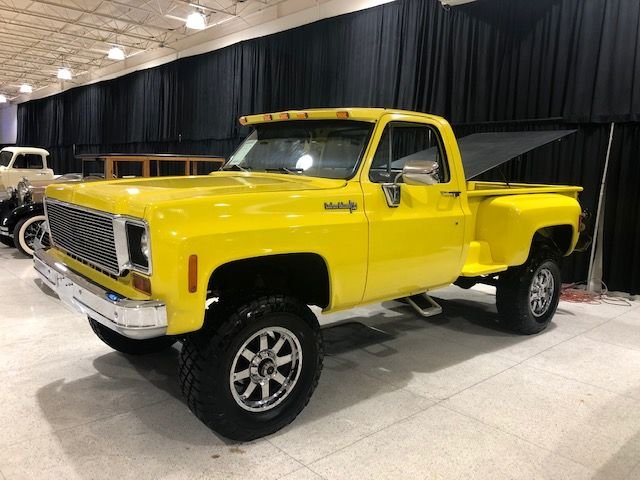 1973 Chevrolet K10 4X4 Short Bed Stepside Pickup Recently Rebuilt V-8 350 Mild Cam Automatic Transmission Competition Yellow Exterior over Black & Yellow Interior Power Steering Power Brakes Billet Grill All New Chrome Custom Wood Bed w/Lift-up Tonneau 4″ Lift w/Over $4,000 in Wheels & Tires Straight Solid Body LED Upper Cab Lights Exterior Sun Visor