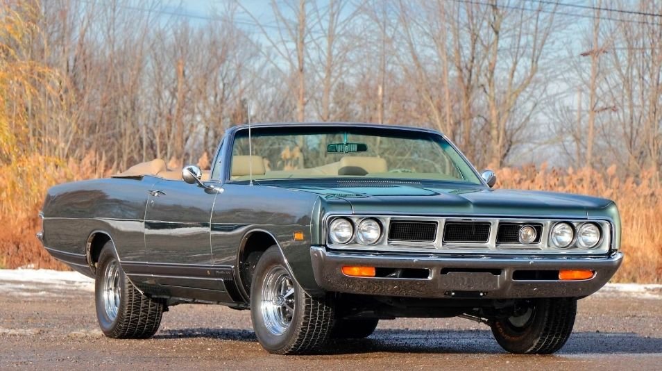 1969 Dodge Polara 500 Convertible 383 V-8 Engine Automatic Transmission Dark Green Exterior over Tan Leather Interior Power Convertible Top with Boot Factory Super-Lite Option Power Steering Power Brakes Power Windows Split Bench Seat Solid State AM Radio A01 Light Group Tinted Windshield Styled Road Wheels Only 573 Polara 500 Convertibles Produced in 1969