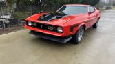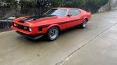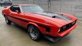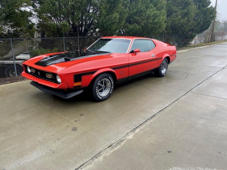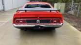 1972 Ford Mustang Mach I Fastback 351 V-8 Engine 4 V Ram Air Automatic Transmission Red Exterior over Black and Red Interior Deluxe Bucket Seats Mustang AM / FM Cassette Radio Center Console with Floor Shift Factory 8,000 RPM Tachometer Power Steering Power Disc Brakes Power Windows Sport Mirrors Seat Belts Rear Window Shade Front and Rear Spoilers Chrome Exhaust Tips Magnum 500 Wheels Goodyear Raised White Lettering Tires Marti Report