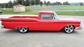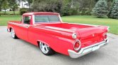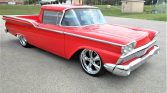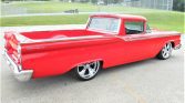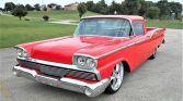 1959 Ford Ranchero Custom Pickup Powerful Built 390 V-8 Engine with Edelbrock Intake Ford C6 3-Speed Automatic Transmission Bright Red Exterior over Black and Red Interior Edelbrock Carburetor and Valve Covers, Aluminum Heads Aluminum Air Cleaner, FPA Shorty Headers with Flow Master Muffler Matson Aluminum Radiation with Electric Fans and Custom Serpentine Belt Set-Up Excellent Chrome, Brightwork and Color Coordinated Rhino Liner Bed Custom Black and Red Leather Interior with Console and Gauges Flaming River Steering Column Power Rack and Pinion Steering Power Brakes Billet Specialtie Steering Wheel, Billet Window Cranks and Door Handles Factory AM Radio and CD Player Dash Clock and Suede Headliner Ford 9-Inch Rear End Rides on 20-Inch Rubber with Custom Chrome Foose Wheels No Expense Spared Restoration and Customization Complete with the Longhorn Tailgate Emblem A Real Eye Catcher and Great Runner!