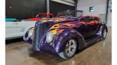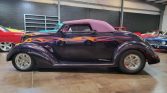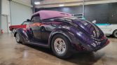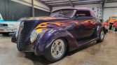 1937 Ford Street Rod Cabriolet 350 Chevrolet V-8 Engine 350 Turbo Automatic Transmission Purple Exterior with Graphics over Lipstick Red Leather Interior Removable Hard Top Vintage Air Conditioning and Heat Dakota Digital Dash Rack and Pinion Steering Tilt Steering Column Power Windows and Driver’s Seat Electric Hood and Trunk Opener Electric Solenoid Doer Actuators AM/ FM/ CD Player Chrome Intake Manifold and Edelbrock Carburetor Chrome Valve Covers, Oil Pan, and Transmission Pan Ceramic Coated Headers Heidts Chrome Front Coil Over Suspension Chrome 4-Link Rear Suspension with Coil Overs 9-Inch Rear Differential Painted and Pinstriped Under Carriage Chrome American Racing Wheels Polished Stainless Steel Fuel Tank