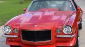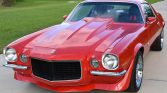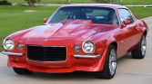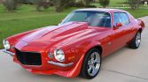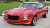 Power is supplied by an overbored 350ci V8 fitted with a Holley 600-cfm double pumper carburetor, an Edelbrock Air-Gap intake manifold, MSD ignition, a Crane Cams camshaft and rocker arms, Hedman ceramic coated headers, 10.75:1 pistons, and a Flowmaster stainless steel dual exhaust. Shifting is through a Muncie four-speed manual transmission, and additional equipment includes a 12-bolt rear end with a 3.73 Positraction differential, a Hurst shifter, an aftermarket steel cowl-induction hood, a back-up camera, LED lighting, power steering, four-wheel disc brakes, and chrome 17? American Racing Torq Thrust II wheels. The car has been repainted red, while the interior features buffalo leather Recaro seats with harnesses, a six-point roll cage, a Momo steering wheel, air conditioning, and an aftermarket sound system.