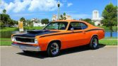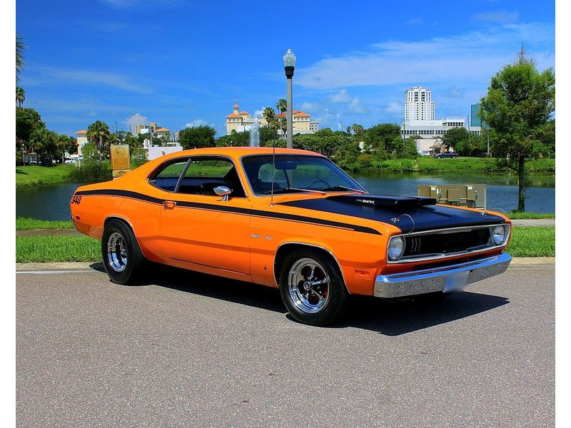 1970 Plymouth Duster Coupe 340 CI V-8 Engine Automatic Transmission Factory EK2 Vitamin C Orange w/Bold Flat Black 340 Stripe Package Exterior over Black Bench Seat Interior Flat Black Dual Snorkel Scooped Hood and Hood Pins Edelbrock Intake and Carb MSD Ignition Headers Dual Exhaust Color Keyed and Detailed Engine Bay w/Engine Dress Up Kit 8 3/4 Rear End Power Steering Power Brakes AM/FM Cassette Radio Keystone Reversed Mag Wheels Racemaster 2.5-26-15 Tires on the Front Deep Reversed Rims w/M & H Racemaster N50-15 Tires on Rear A Real Head-Turner with an Aggressive Stance!