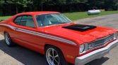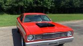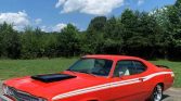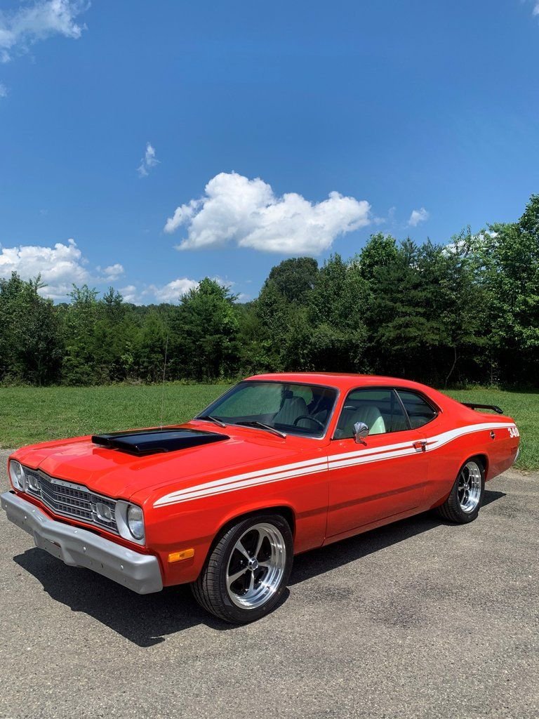 1973 Plymouth Duster Coupe Rebuilt 340 V-8 Engine H Code 4-Speed Manual Transmission with Pistol Grip Shifter Orange Exterior over White Bucket Seat Interior True 340 H Code Duster Ice Cold Factory Air Conditioning Power Steering Disc Brakes Aluminum Intake Ceramic Coated Headers New Clutch New Drive Shaft 410 Posi-Traction Rear End New Wheels and Tires Build Sheet Undercarriage is in Great Condition