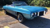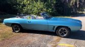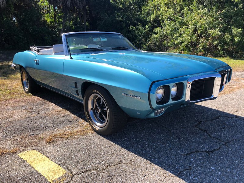 1969 Pontiac Firebird Convertible 350 V-8 Engine Automatic Transmission Crystal Blue Exterior over White & Tan Interior White Power Convertible Soft Top Power Steering Power Brakes Wood Rim Steering Wheel Gauge Pack Pontiac Rally Wheels