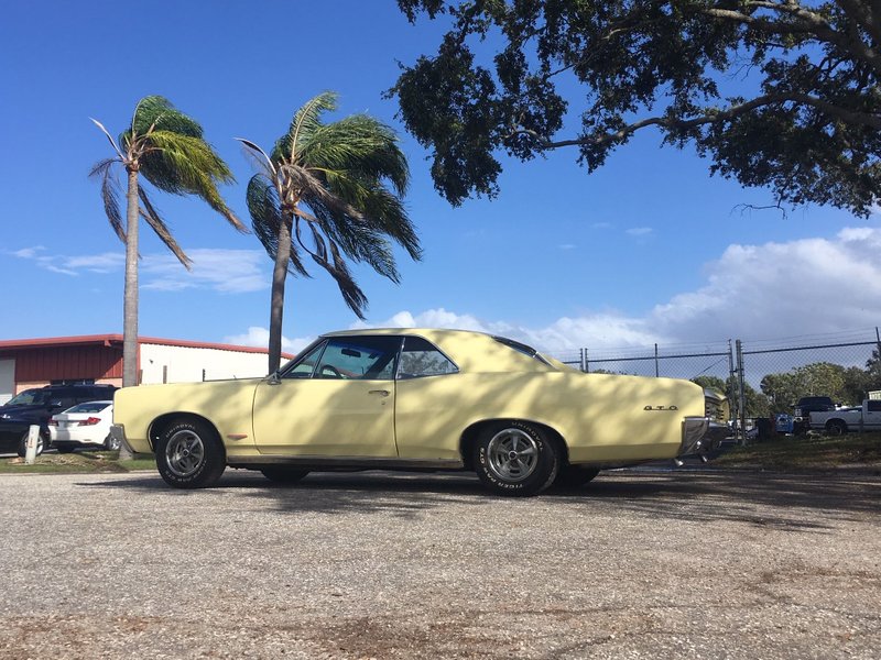 1966 Pontiac GTO Coupe 326 V8 Engine Automatic Transmission Yellow Exterior over Black Interior Power Steering Power Brakes Bucket Seats w/Console Wood Steering Wheel New Paint and Interior New Dual Exhaust, Brakes, Wheels and Tires Detailed Trunk w/Original Jack Rally II Wheels Correct Spare Tire