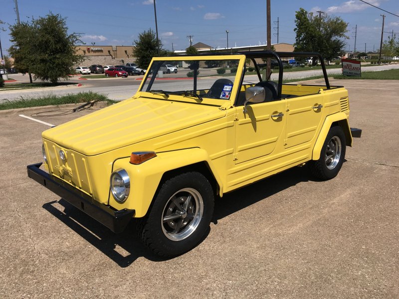 1973 Volkswagen Thing Convertible Rebuilt Dual Port 4 Cylinder Engine 4-Speed Manual Transmission Yellow Exterior over Black Interior Fresh Brakes Fresh All Terrain Tires and Empi Wheels Rare Hard Top
